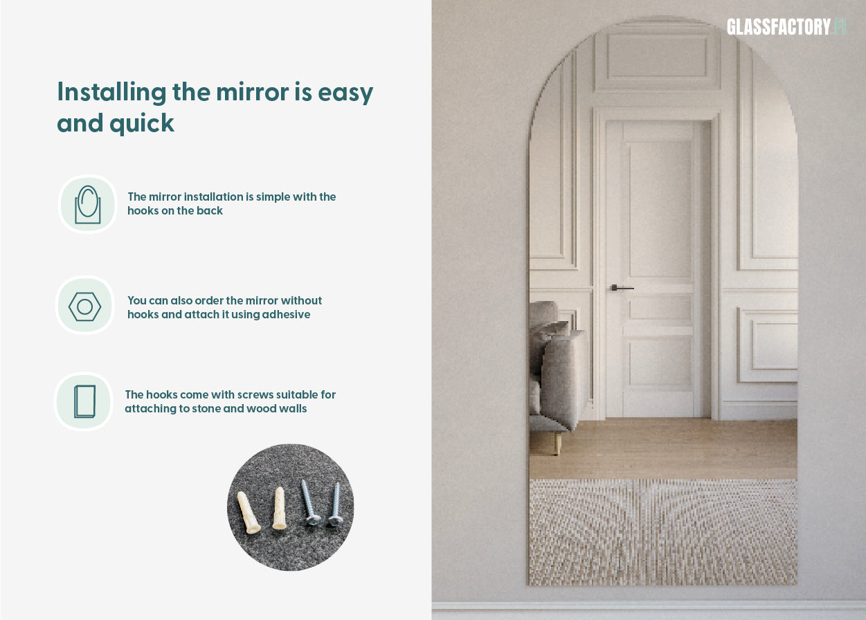 There are several standard sizes of Arch mirrors with and without LED lights. This mirror is delivered without LED lights, with hanging hooks on its back and removable legs at the bottom, allowing it to be adjusted to 0-15 mm in height. We recommend installing the mirror a few millimeters above the floor to reduce the risk of damage. The mirror can also be hung on the wall using the hooks on the back.