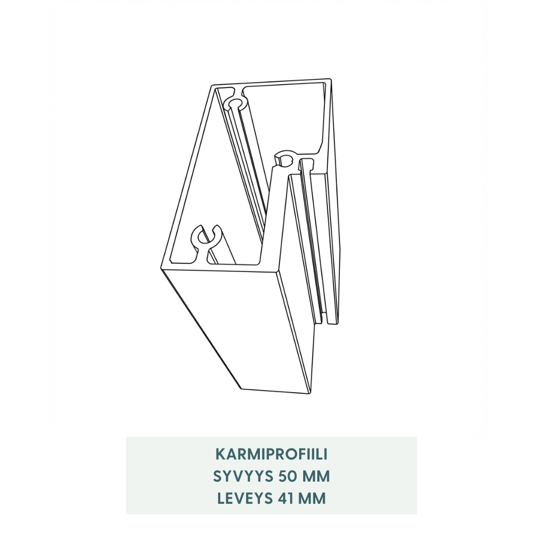 Oveessa on siro 41x50 mm kokoninen alumiinikarmi, joka sulautuu osaksi tilaa ilman raskasta ilmettä. Karmin ja oven välissä oleva tiiviste pitää kosteuden ja höyryn tehokkaasti oikealla puolella.