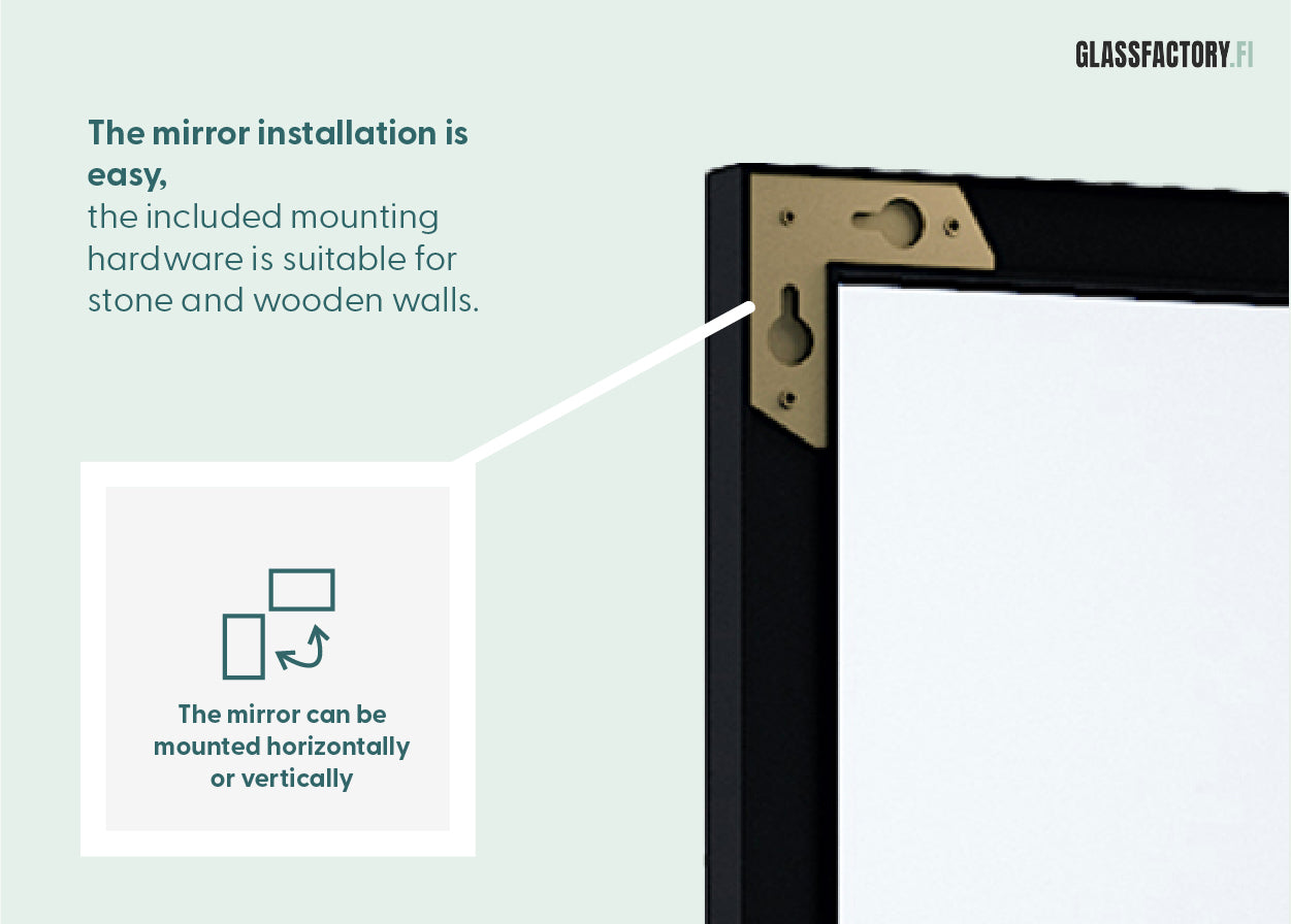 With the hanging hooks located on the back, this mirror offers the flexibility to mount it on the wall or position it on the floor. This long mirror can be installed either horizontally or vertically. Dimensions are always indicated as width x height. The thickness of the mirror is 20 mm and the width of the frame is 7 mm.