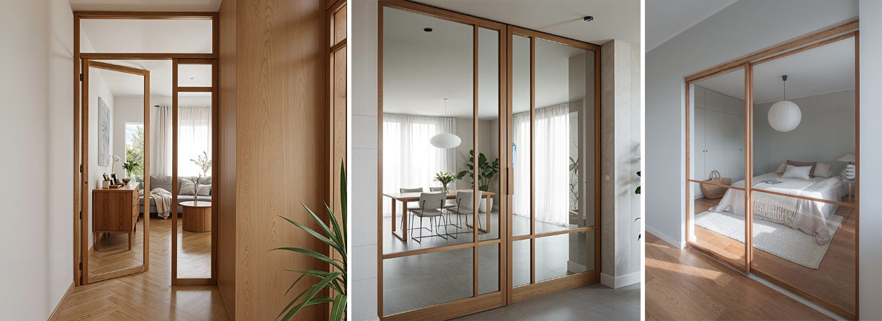 Oak Collection -sarja -sarjan tammikehyksiset ovet ja lasiseinät. Käsityönä Porvoossa valmistetut liukuovet, pariovet ja lasiseinät – ajaton ja kestävä ratkaisu.