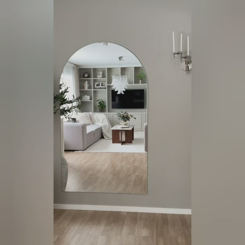Die Bogenspiegel sind in mehreren Standardgrößen erhältlich. Dieser Spiegel mit den Maßen 100x170 cm eignet sich für Eingangsbereiche oder für jeden anderen Raum.