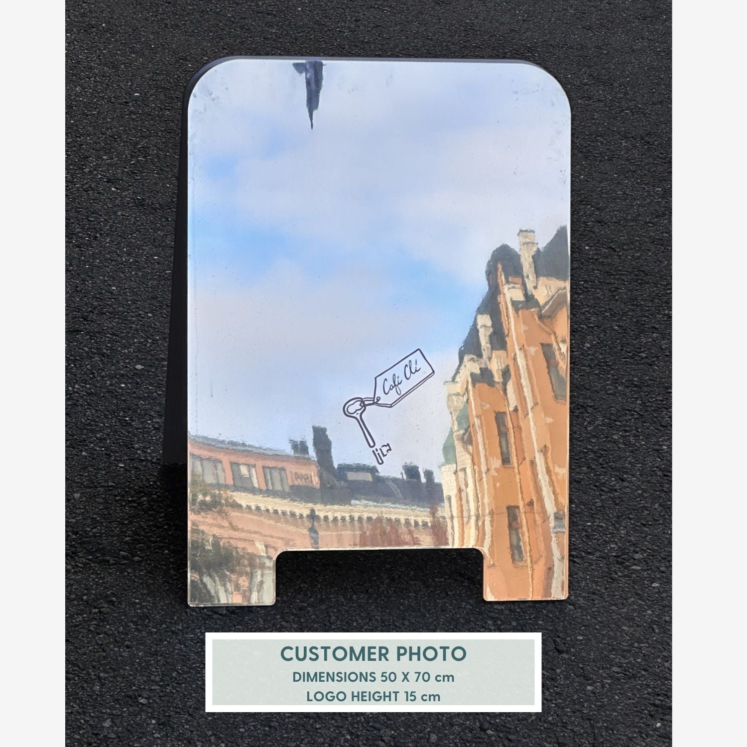 Auf beiden Seiten des A-Frame Spiegelständers befindet sich eine Spiegelfläche, auf der Sie Ihr Logo oder Ihren Slogan anbringen können. Auf beiden Seiten erscheint das gleiche Design. Halten Sie den Text so klein wie möglich und achten Sie darauf, dass die Schriftgröße zwischen 3 und 8 cm liegt, um eine optimale Sichtbarkeit zu gewährleisten. Das Logo und/oder der Slogan werden in weißer Schrift angebracht.