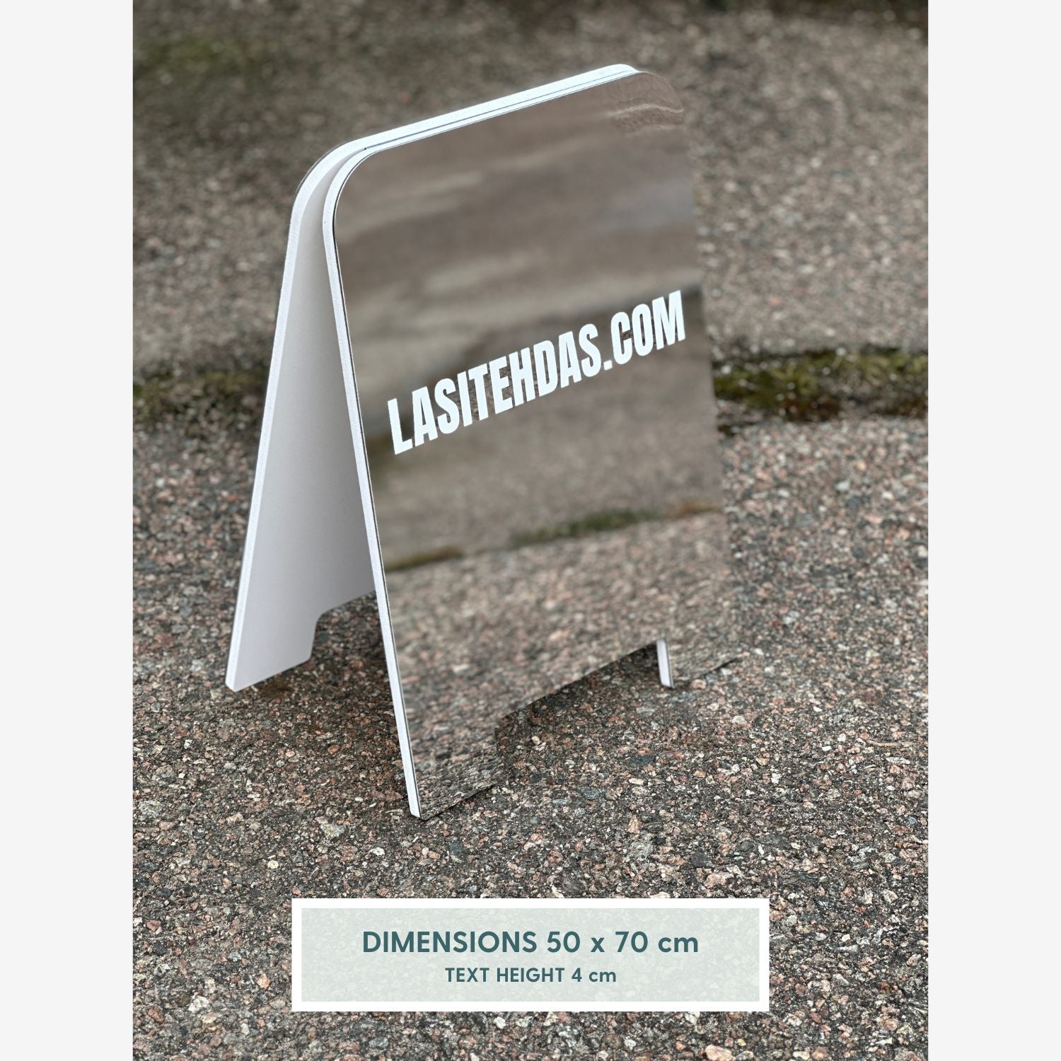 Der Spiegelständer ist ein 50 x 70 cm großes, leichtes (3 kg) A-Frame-Display. Er kann sowohl drinnen als auch draußen verwendet werden. Er ist mit stabilen Füßen ausgestattet, kann aber aufgrund seiner Leichtigkeit an windigen Orten umkippen. Um die Standfestigkeit zu gewährleisten, ist es ratsam, den Ständer nicht an einem windigen Ort aufzustellen.