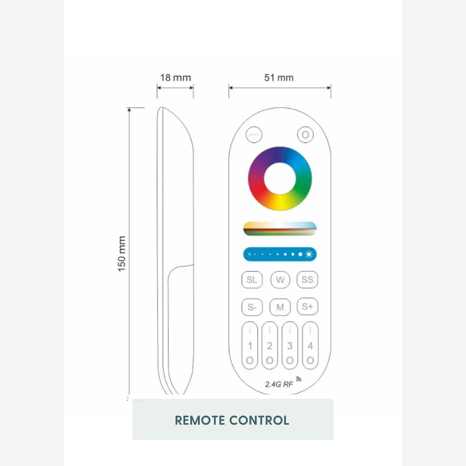 The included remote control allows you to select your preferred light shade from thousands of options. The light output is 10W per metre. The light shines directly onto the wall, creating a soft ambiance. The LED strip has an IP52 code.