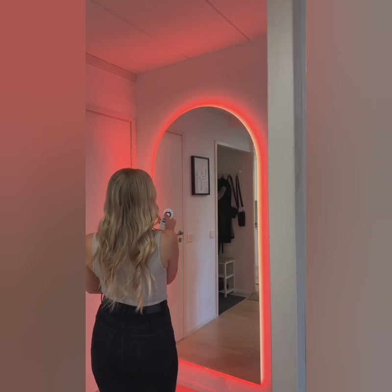Unlike regular backlit mirrors, this one offers countless colour options instead of just one background colour. You can also select standard white light (3000K) for a more traditional look. Adjust the backlight colours using the included remote control or via a mobile app connected through Bluetooth or Wi-Fi. Tailor the light’s tone to create the perfect lighting for any occasion.