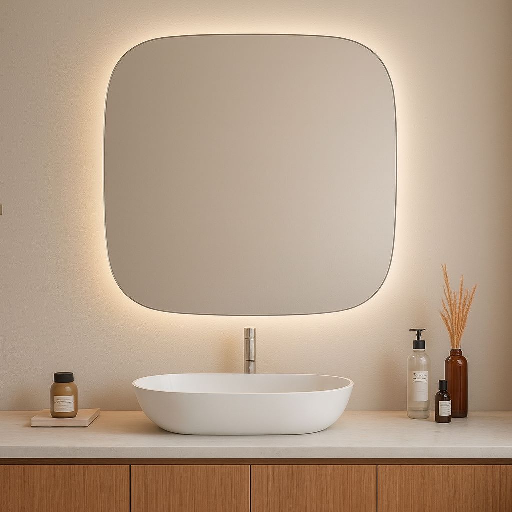 Väggspegeln med belysning har en aluminiumram på baksidan, som passar i den medföljande transformatorn. Själva ramen är 25 mm tjock, och den totala tjockleken på spegeln, inklusive ramen, är ca 29 mm. Den snyggaste installationen uppnås om elledningarna kommer från baksidan av spegeln.