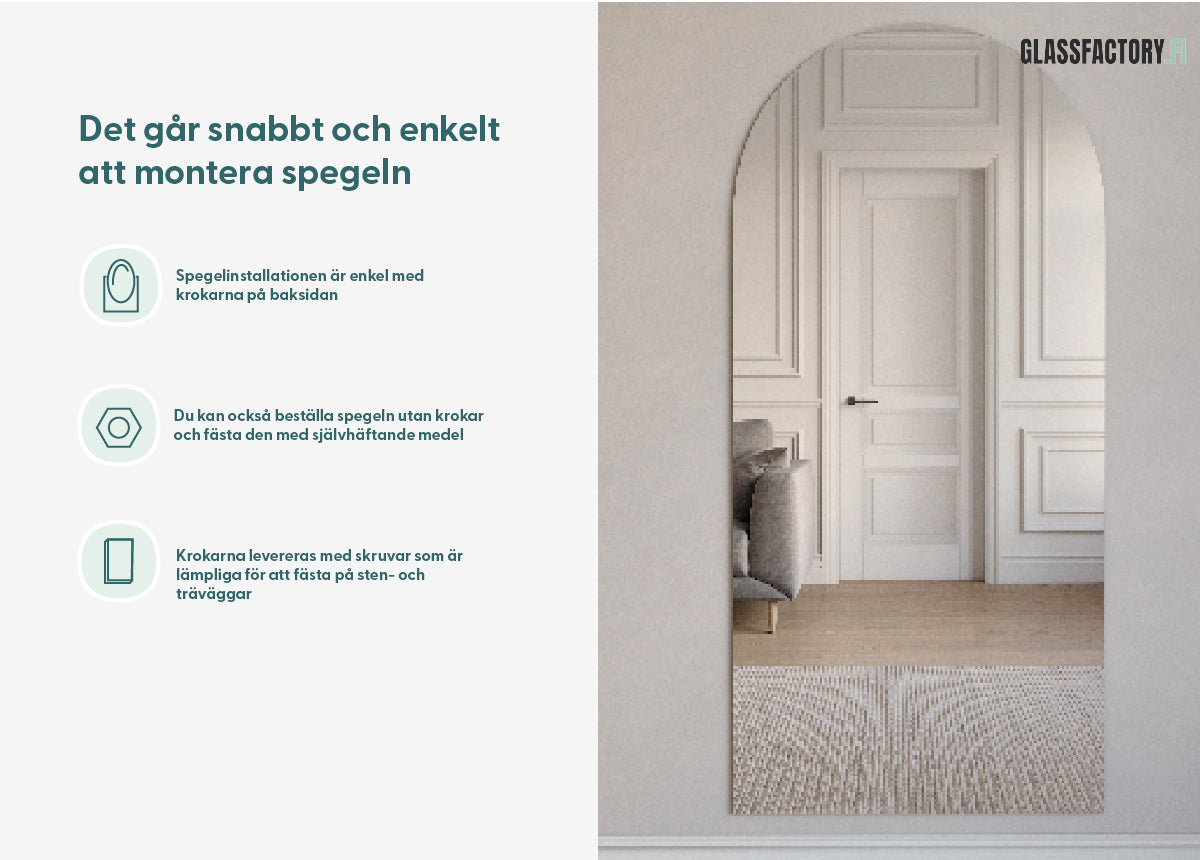 Arch-speglar med och utan LED-lampor finns i flera olika standardstorlekar. Denna spegel levereras utan LED-lampor, med upphängningskrokar på baksidan och löstagbara ben i botten, vilket gör att den kan justeras till 0-15 mm höjd. För att minska risken för skador rekommenderar vi att du installerar spegeln några millimeter ovanför golvet. Spegeln kan också hängas upp på väggen med hjälp av krokarna på baksidan.