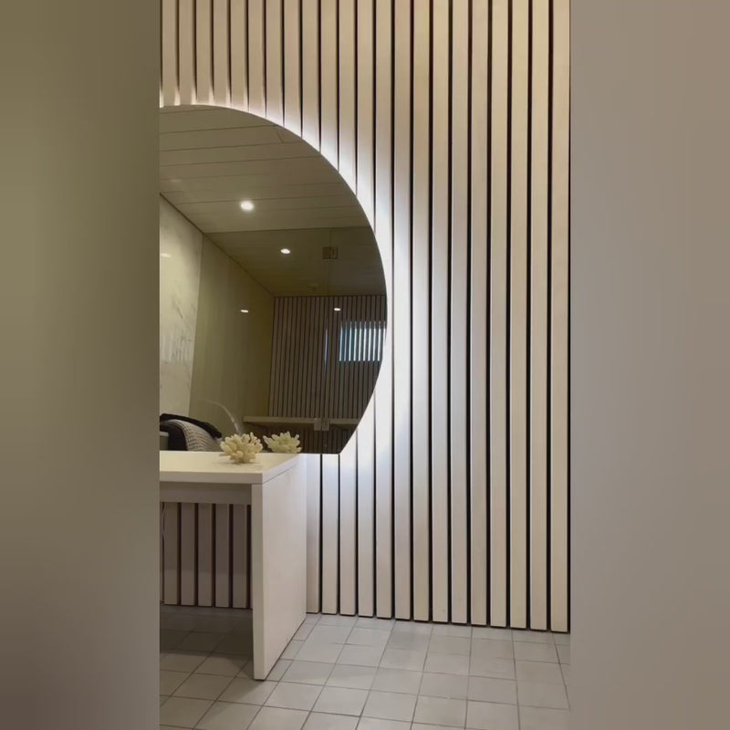 Spegeln med belysning har en aluminiumram som passar i den medföljande transformatorn. Ramen i sig är 25 mm tjock, och den totala tjockleken på spegeln, inklusive ramen, är ca 29 mm. Du kan installera spegeln i alla fyra riktningarna, utan LED-lampa på den raka kanten. Den snyggaste installationen uppnås om elledningarna dras bakom spegeln.